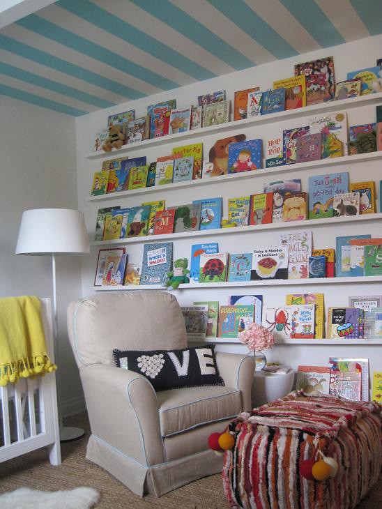 Next up on the big nursery to do list is to hang some front facing book shelves. I think you get so much bang for your buck here; easy and inexpensive plus a great way to graphically fill up a wall, and such a cool system for little ones to be able to pick out their own books more easily.